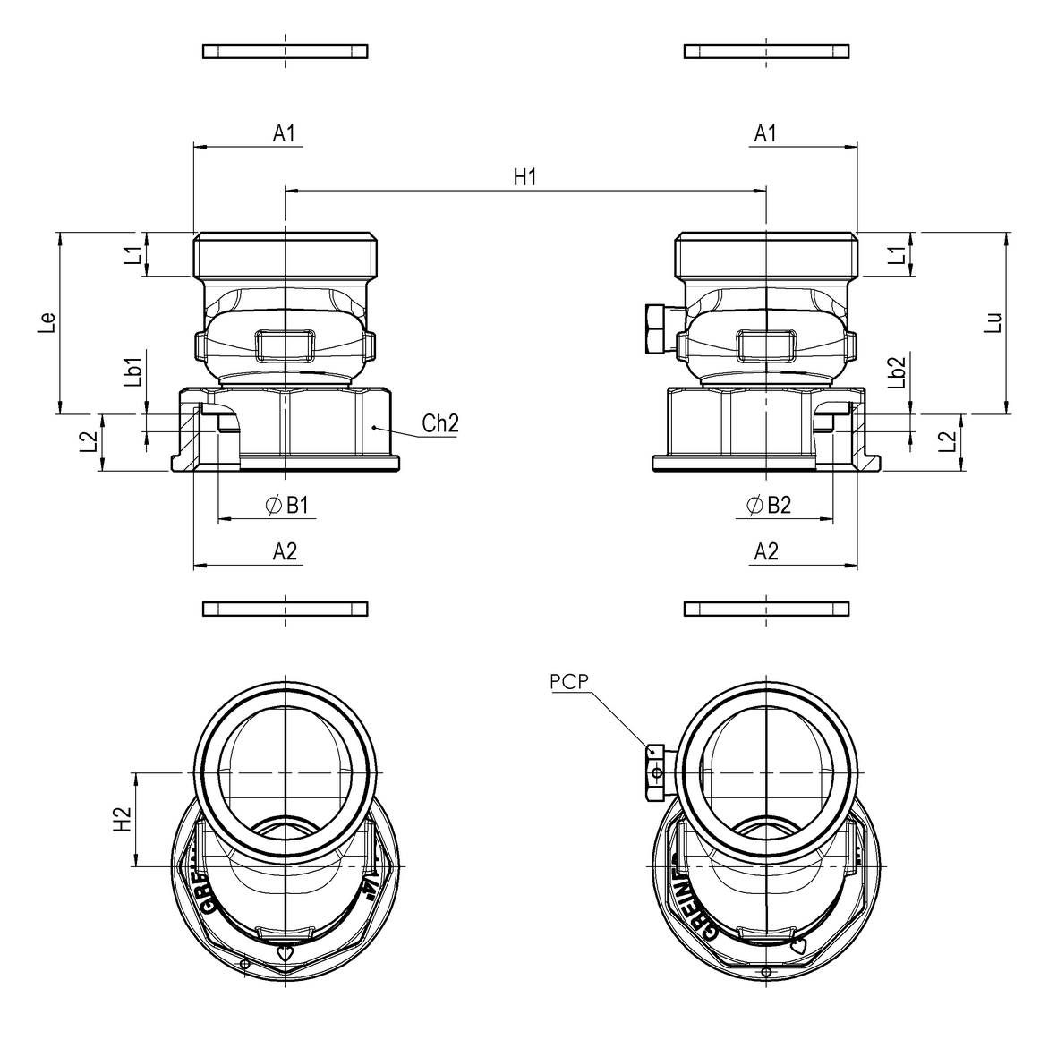 | Code | Kg | Box | Master Box | M | F | NA | NA | NA | Le | Lu | Lb1 | Lb2 | ØB1 | Combinazione | Tipo Contatore | A1 | A2 | ØB2 | L1 | L2 | H1 | NA | d | ØT | ØP1 | ØP2 | NA | A3 | Q | PN-MOP | PCP1 | PCP2 | NA | NA | NA | NA | NA | NA | NA | NA | NA | NA | cod. | H2 | Ch1 | Ch2 | Ch3 | |